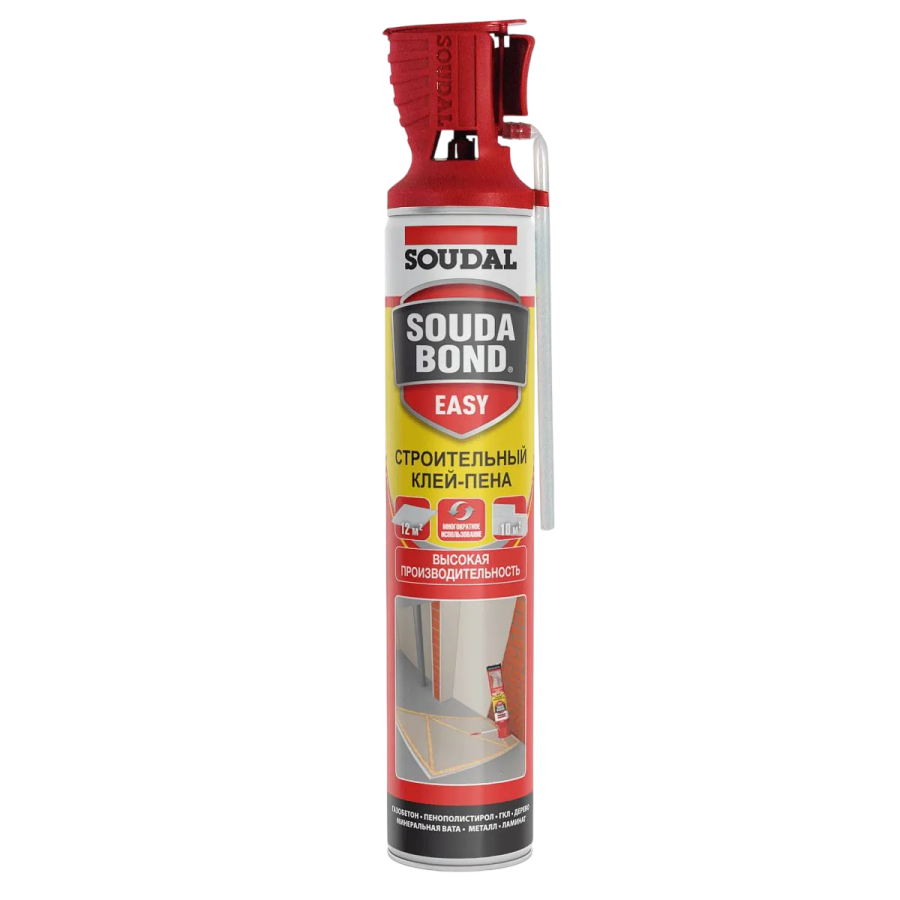 Полиуретановый клей в форме аэрозоля, предназначенный для быстрого и надежного крепления гипсокартонных плит и панелей из пенополистирола (пенопласта). Может использоваться как внутри помещений, так и на фасадах зданий. Клей готов к использованию, без дополнительных инструментов. Он быстро сохнет (около 60 минут), обладает высокой производительностью (12 м²/полоса 30 мм), не стекает с вертикальных поверхностей (тиксотропный), улучшает тепло- и звукоизоляцию. Клей имеет отличную адгезию к большинству материалов (кирпичу, бетону, штукатурке, гипсу, дереву, металлу и пластмассам). При необходимости шов может быть окрашен.
